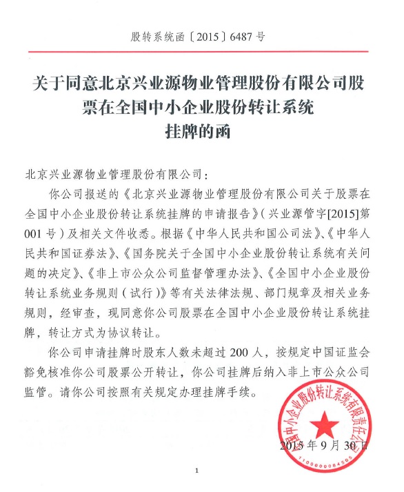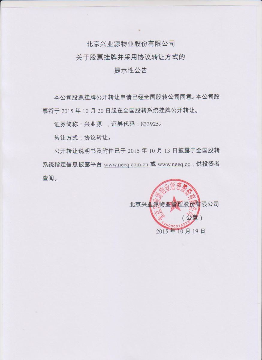 北京兴业源科技服务集团股份有限公司(原名北京兴业源物业管理股份有限公司)和各新三板业务合作单位(券商、会计事务所和律师事务所)经过一年多的努力,于2015年8月17日正式把北京兴业源科技服务集团股份有限公司(原名北京兴业源物业管理股份有限公司)公开转让说明书上报至全国中小企业股份转让系统有限责任公司。